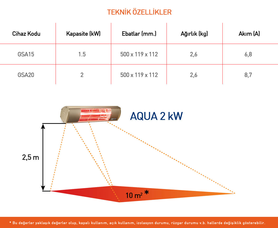 Üşümeye de pişmeye de son! Sert iklim koşulları, sert rüzgarlar, montaj yükseklikleri artık sorun değil. AQUA serisinde bulunan dört ayrı kapasite sayesinde tüm koşullarına uygun ısıtma kapasitesi belirlenebilir.